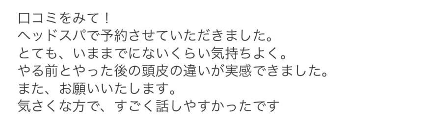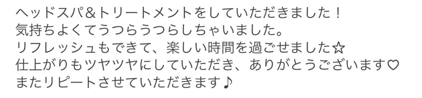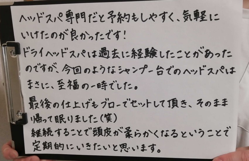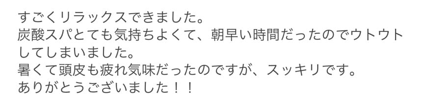 既に体験されたお客様から、続々と嬉しいお声をいただいております。 本当にありがとうございます。 これからも、お客様全員のヘッドスパに全力で取り組んでまいります。